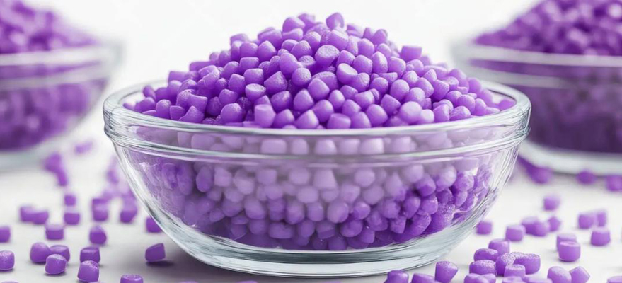 The Violet Pearl Masterbatch offers a royal, luxurious violet hue with a reflective pearlescent appearance.